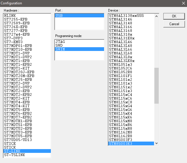 Для начала проверим прошивку с помощью STVP. Запустите программу STVP. Впервые появится следующее окно. Отсюда мы должны выбрать программатор ST-Link, интерфейс SWIM и наш микроконтроллер.