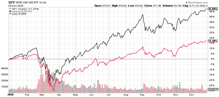 COVID-19 полностью изменил привычную парадигму, и очевидно, что тенденция онлайн в работе и жизни останется надолго, если не навсегда (в виду ее эффективности для бизнеса). Поэтому опережающая динамика Nasdaq 100 (QQQ) над S&P 500 (SPY), на мой взгляд, сохранится.