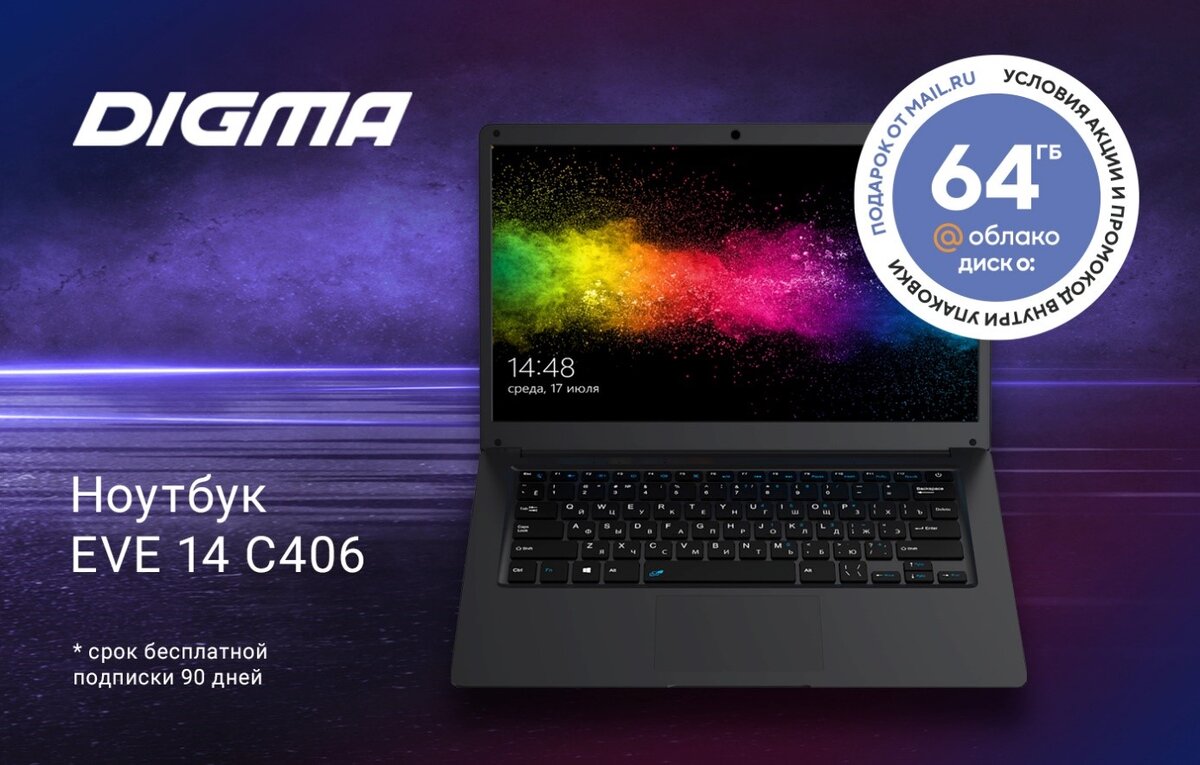 DIGMA, производитель цифровой техники и электроники, объявил о выходе нового ноутбука — EVE 14 С406. Устройство получило хороший набор технических характеристик, а также специальный и очень полезный промо-подарок от компании Mail.ru.