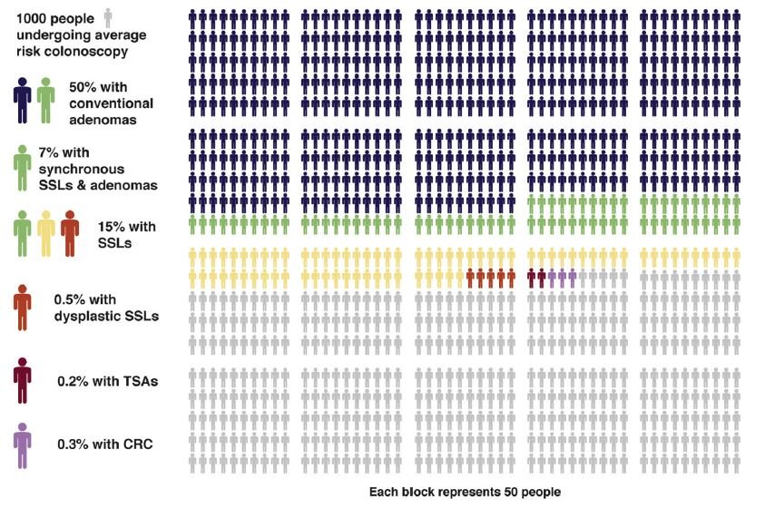 Считается, что около четверти случаев спорадического КРР (колоректального рака) происходит из-за зубчатых полипов, которые подразделяют на гиперпластические (HP), стелющиеся (SSL) и редко встречающиеся традиционные (TSA). Согласно новым критериям ВОЗ, теперь стелющиеся зубчатые полипы (аденомы) принято называть lesions, т.е. поражения (SSL). Они так мало похожи на аденомы и настолько не похожи на полипы, благодаря чему и название получили весьма неопределенное. Интересно, что распространенность SSL по новым данным достигает 22%. Еще пару лет назад этот показатель не достигал и 10%. Видимо, информированность коллег о проблеме стала приносить плоды. По данным ВОЗ, о синдроме зубчатого полипоза (SPS) говорят по меньшей мере 5 зубчатых полипов проксимальнее прямой кишки размерами 5 мм и более, 2 из которых не менее 10 мм. А также если у пациента 20 и более зубчатых полипов любого размера в разных отделах, из которых 5 проксимальнее прямой кишки. Стоит отметить, что в эти подсчеты входят все подтипы зубчатых полипов, т. е. и гиперпластические. Распространенность этого синдрома составляет 0,5%, но такие критерии, думаю, приведут к росту данного показателя. Однако, предостерегаю, не стоит путать его с истинным ростом заболеваемости.