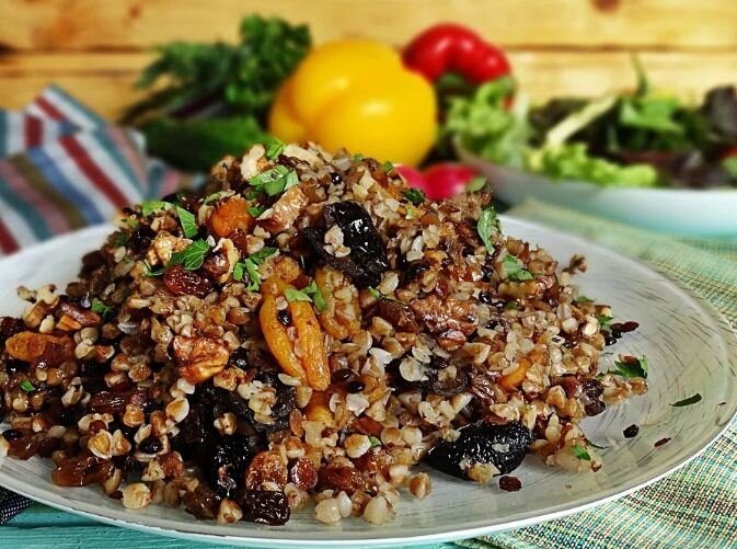 6. Смешать гречку с сухофруктами и мелко порезанной зеленью.
