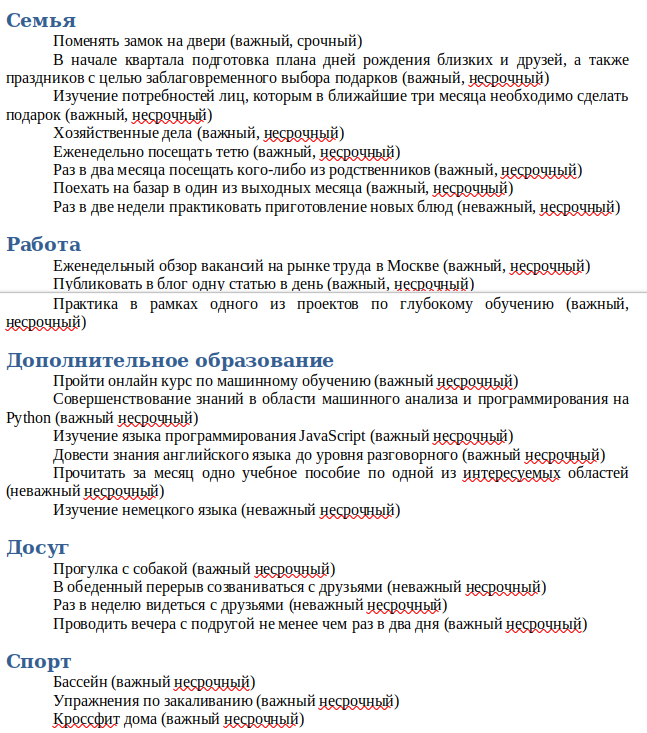 - определить сферы интереса и перечислить привязанные к ним задачи (например, "семья, работа, дополнительное образование, досуг, спорт");