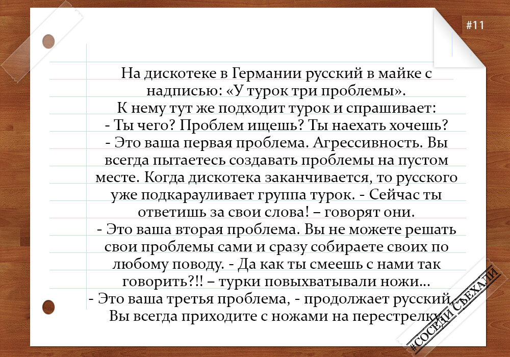 Рассказал эти анекдоты соседям, после чего они съехали.