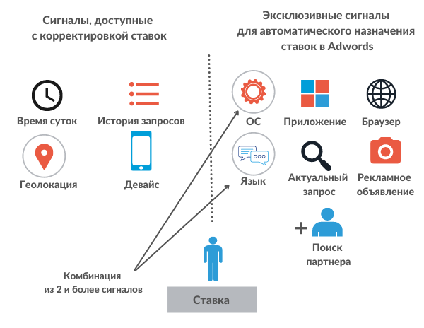Успешное применение продвинутых технологий машинного обучения для показа релевантных объявлений реализовано и в Google Ads. С помощью инструмента Smart Bidding происходит интеллектуальное назначение ставок в аукционе в режиме реального времени. Это означает, что когда пользователь делает поисковый запрос, система анализирует множество сигналов — атрибутов, передающих сведения о пользователе и позволяющих понимать контекст запроса: