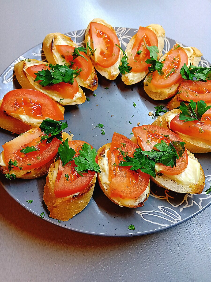 🔻 Нарезаем багет и немного обжариваем на сухой сковороде, чтобы получилась хрустящая корочка. Чеснок натираем на мелкой тёрке и перемешиваем с майонезом. Нарезаем помидорку.