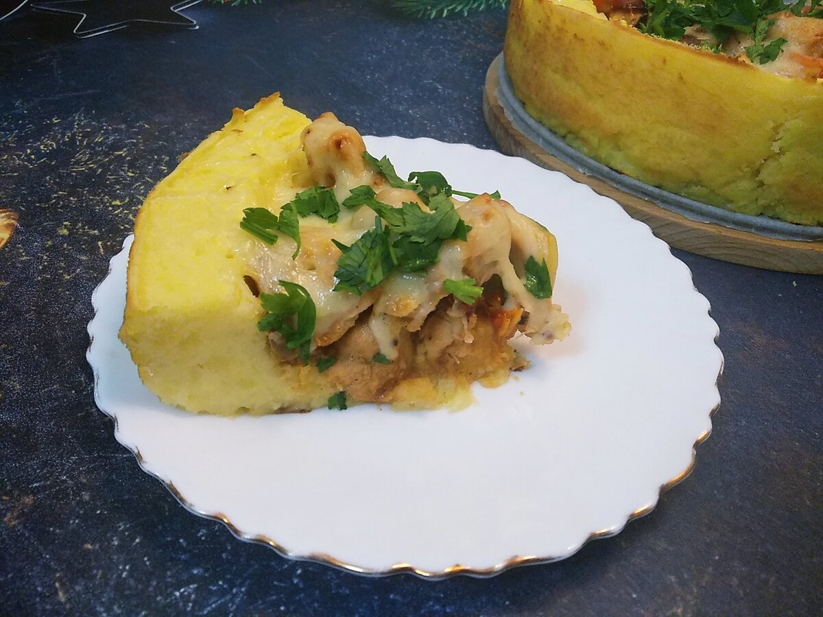 Выкладываем в форму картофельное пюре и аккуратно распределяем формируя бортик, в центре делаем углубление.