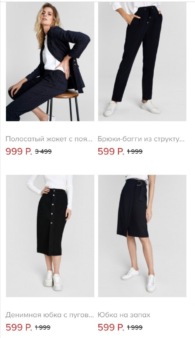 В подборке мы видим несколько юбок и брюки, которые можно приобрести за 599 рублей вместо 1999 (приглянулась юбка с пуговицами), а так же жакет (единственная "дорогая" вещь до скидок) за 999 рублей вместо 3499.
