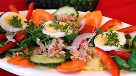 Смешайте морковь, зелень, лук, яйца, болгарский перец, тунец и огурец. Полейте равномерно заправкой.
