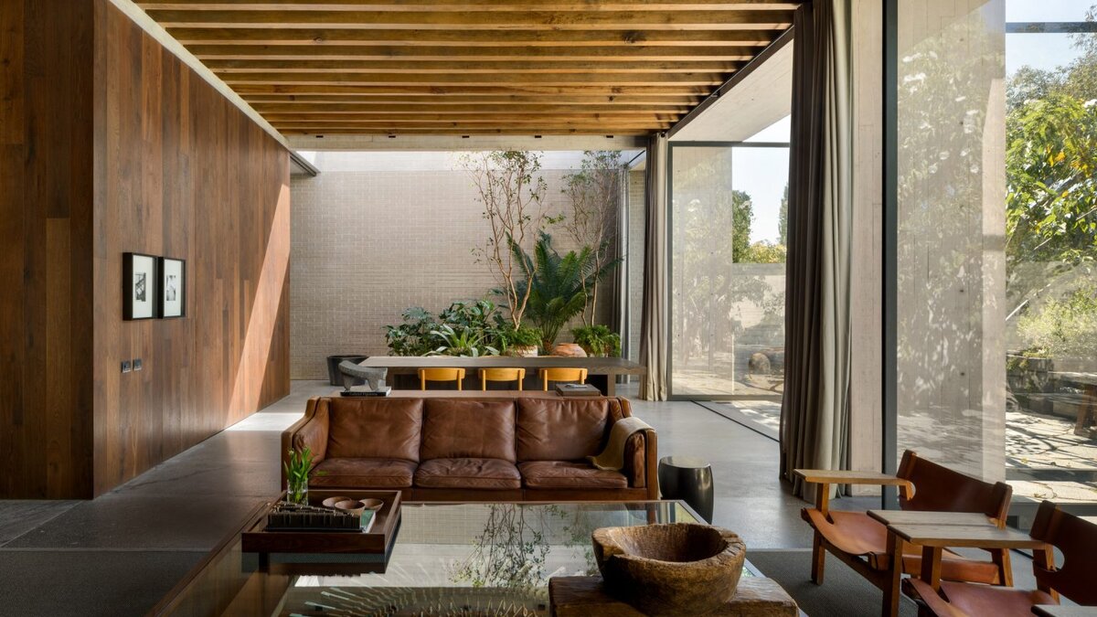 Сервантес использовал единую палитру материалов для всего дома. Использование литого бетона и бетонных блоков позволяет некоторым пространствам выглядеть более прохладными и утилитарными, а богато окрашенный орех создает ощущение тепла.