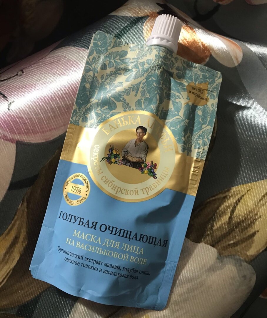 На сегодняшний день покупаю уже 3 такую маску. «Банька Агафьи секреты сибирской травницы. Голубая очищающая маска для лица на васильковой воде».