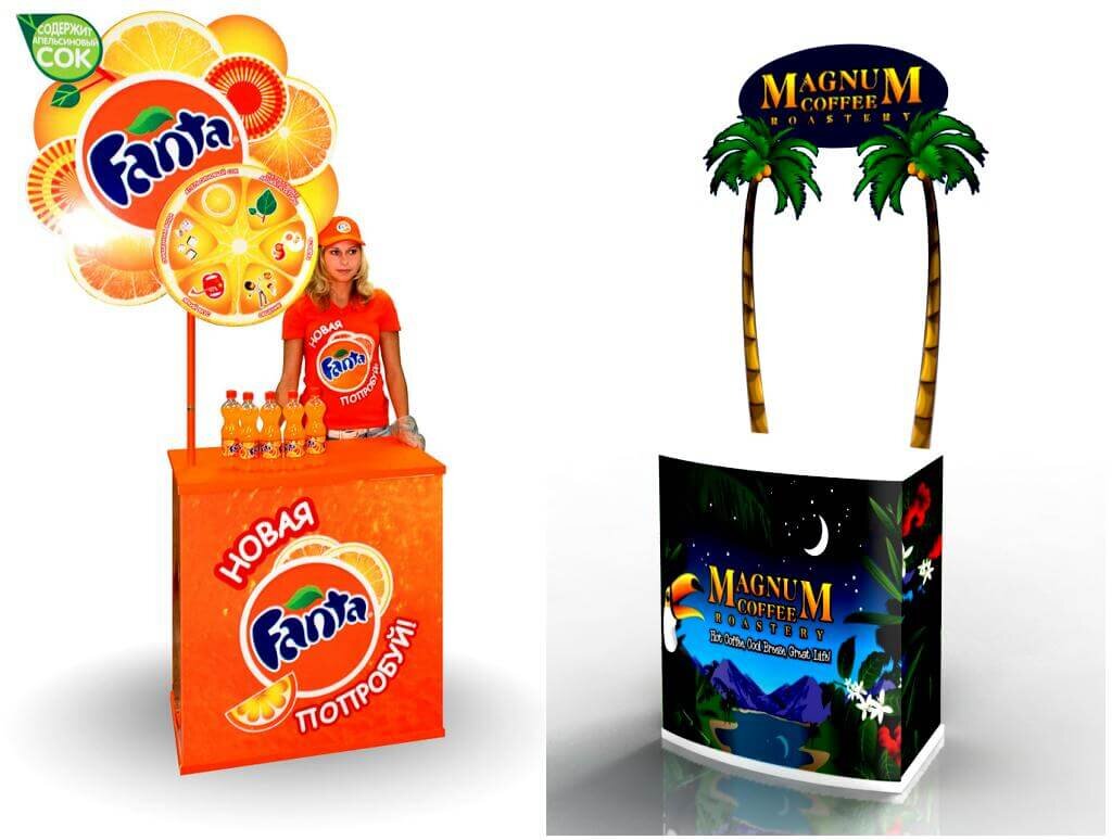 - легкие и недорогие конструкции из прочного картона с ярким логотипом бренда — для разовых промоакций, продвижения новых компаний и брендов;