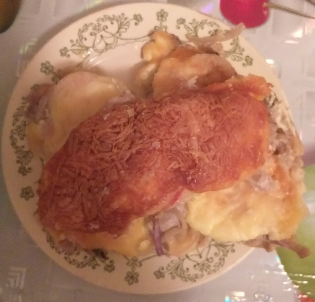 🍄Грибы порезать на пластинки, и выложить на🥩 мясо.