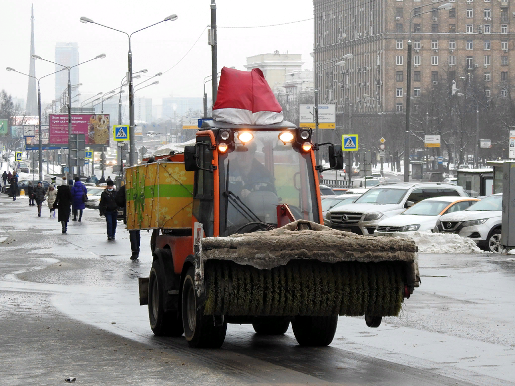 Пара фотосюжетов с улиц. Коммунальный трактор в дедморозовской шапочке. Централизованно их не выдавали и значит тракторист сам пошил украшение на своего «трудового коня».