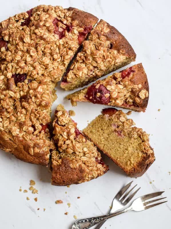 Этот пирог можно приготовить из любых косточковых фруктов, но сливы придают ему кислинку, которая прекрасно дополняет подсыпку из овсяных хлопьев. Мне нравится использовать красные или черные сливы, поскольку они также дают лучший контраст цвета на фоне торта.