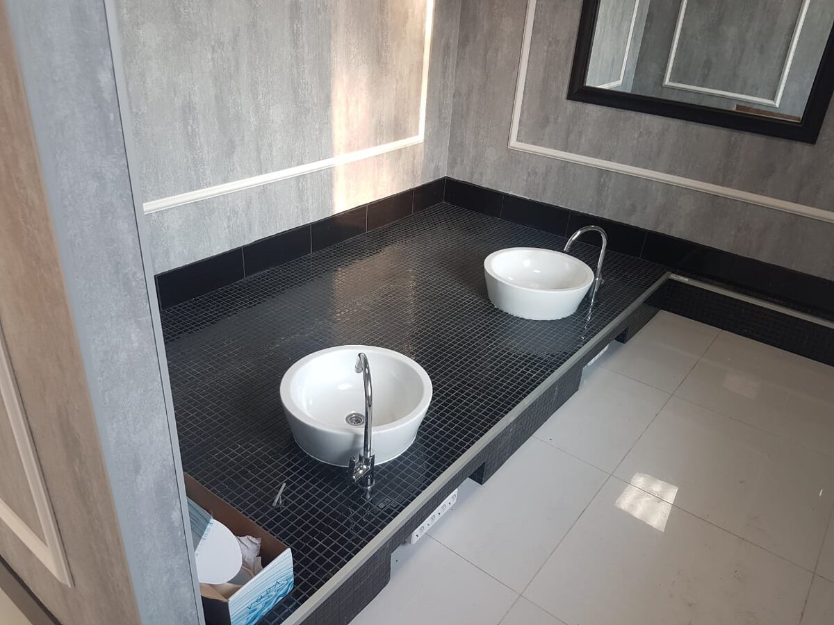 Смонтировали подиум для педикюрной. Обшили ГВЛ листом для укладки мозаики. Установили напольные ревизионные люки скрытого типа для обслуживания сантехники. В нишах установлены розетки для удобства подключения оборудования.