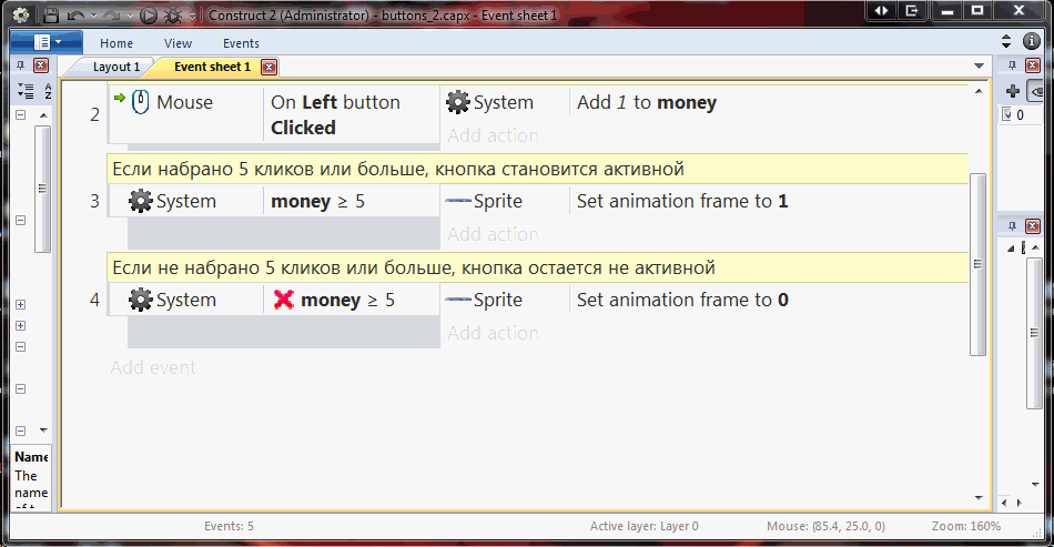 Теперь очередь работать со вкладкой Event sheet и одной глобальной переменной.