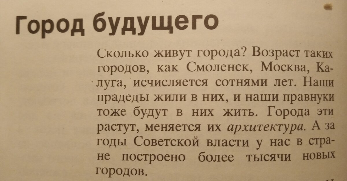Сколько живут города? Возраст таких городов, как Смоленск, Москва, Калуга, исчисляется сотнями лет. Наши прадеды жили в них, и наши правнуки тоже будут в них жить. Города эти растут, меняется их архитектура. А за годы Советской власти у нас в стране построено
