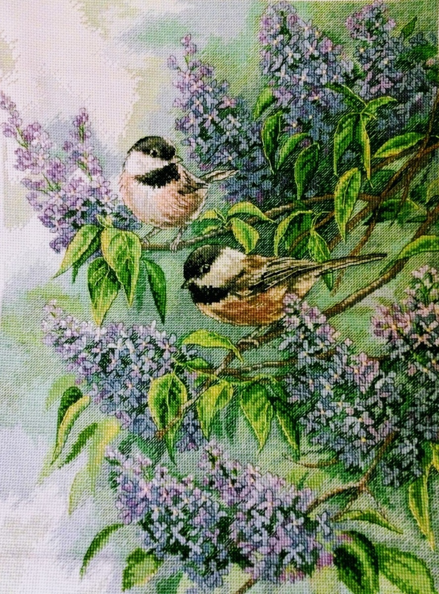 Мой самый большой процесс, законченный в 2020 году- это набор от Dimensions арт. 35258, Синицы и сирень (Chickadees and Lilacs)