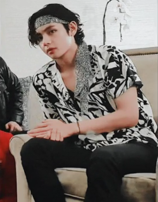 Длинные волосы и узорчатая рубашка Ви придали ему превосходный вид, незабываемый для фанатов.