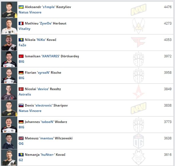 На втором месте по этому показателю находится Матье ZywOo Эрбо — 4 273 убийства, а третье место занял Никола NiKo Ковач — 4 053