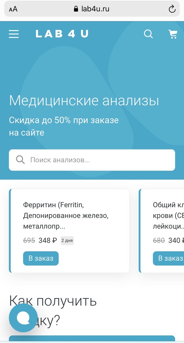 Далее выбираете нужный Вам анализ, если у Вас большой список анализов, можно направить его в чат помощнику и он соберёт корзину за Вас, Вам останется только выбрать удобный медцентр, время сдачи и оплатить заказ.
