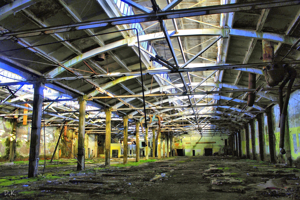 Скорее всего цех такой раздолбанный из-за того, что сами работники его и начали разбирать, ибо не видели в нём смысла, оборудование пошло в другие цеха или на продажу. Да и цех был полностью доступен для всех некоторое время, тогда и металлисты успели сделать набеги. А сейчас никому нет дела до этого цеха, кроме нас :)