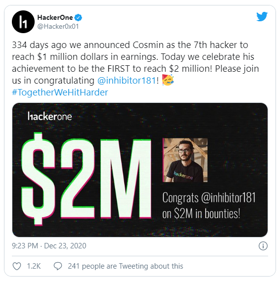 Как сообщила компания HackerOne (Сан-Франциско, США), заработать на платформе самую крупную сумму в ее истории удалось эксперту в сфере информационной безопасности из Румынии – по итогам 2020 г. размер полученного им вознаграждения за поиск уязвимостей достиг $2 млн.