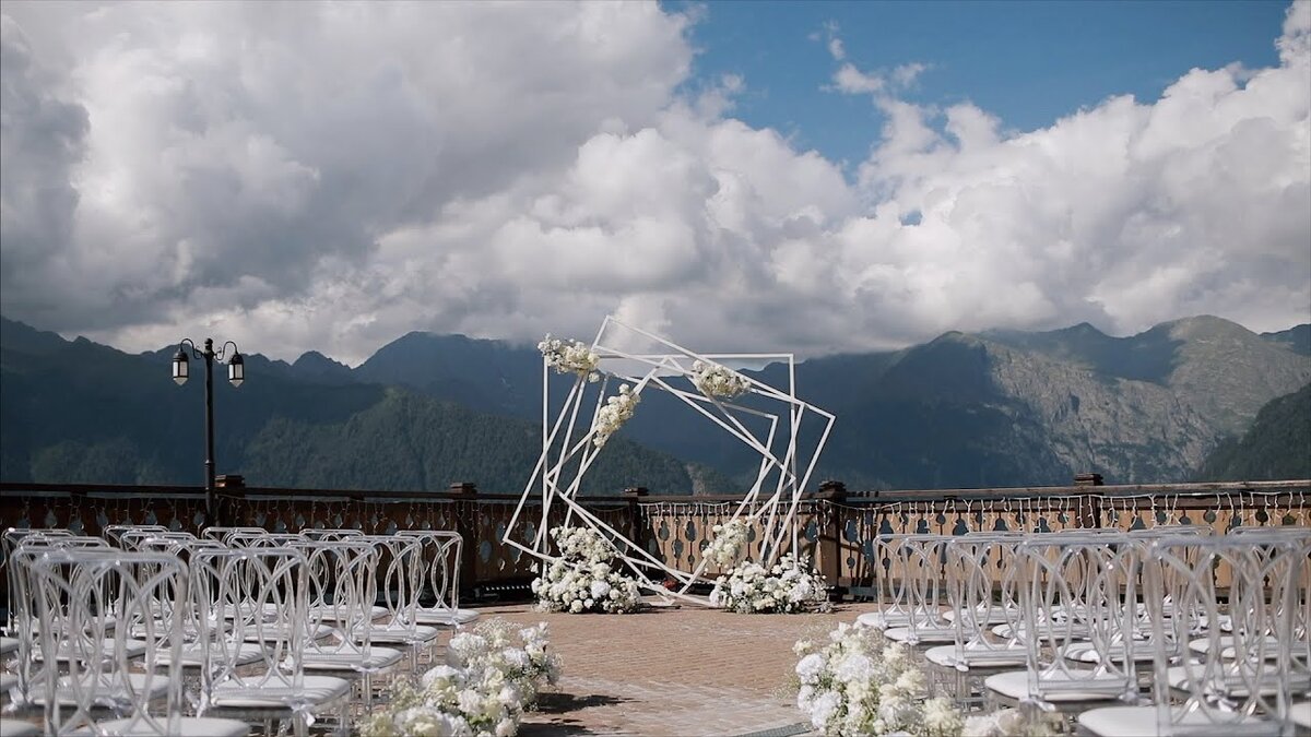 Сборы жениха и невесты в отеле Имеретинский на берегу моря в Сочи. Совместные сборы жениха и невесты в номере отеля. Свадебная прогулка на вершине курорта Красная Поляна на высоте 2200 метров. Свадебная церемония на открытой площадке с видом на горы на высоте 1389 метров. Трогательные клятвы жениха и невесты. Свадебный банкет на закате в