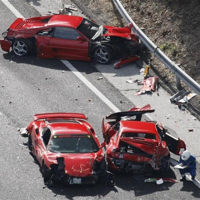 Впрочем, все эти инциденты меркнут на фоне кармагеддона, случившегося в декабре 2011 в Японии. Говорят, это самая дорогая авария в истории, общий ущерб составил $4 миллиона. Участниками ДТП стали 14 машин, среди которых 8 Ferrari, 3 Mercedes-Benz, Lamborghini Diablo,