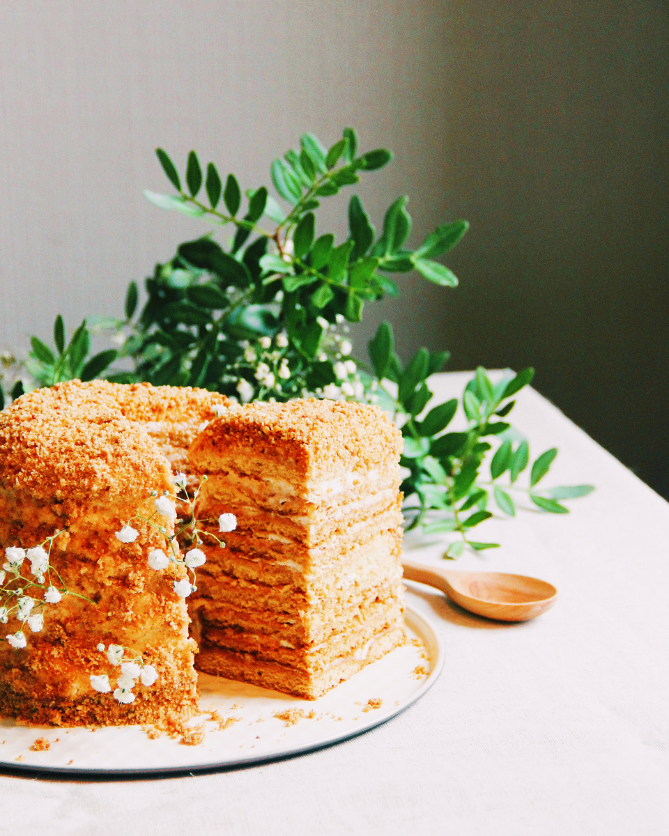 • Промазываем кремом коржи и бока нашего почти готового медового торта.