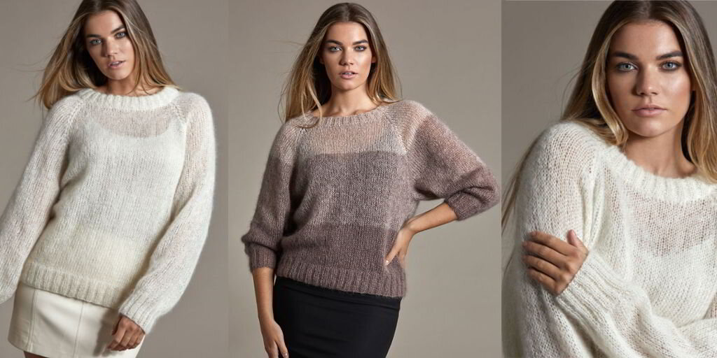 Женский свитер из мохера с формированием регланом из новой коллекции Ким Харгривз можно связать как однотонным, так и с градиетным переходом.