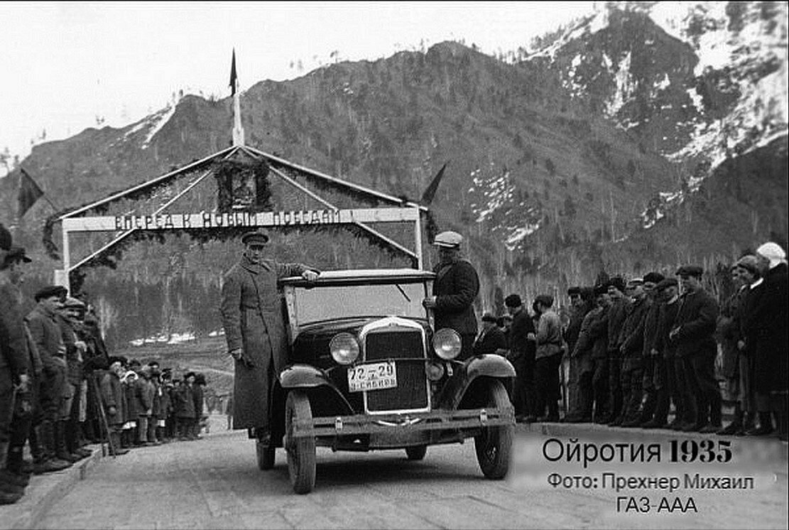 Очень ценно и то, что на снимке есть надписи места, года, марки автомобиля и автора снимка. "Ойротия 1935 г. фото: Прехнер Михаил, ГАЗ ААА".