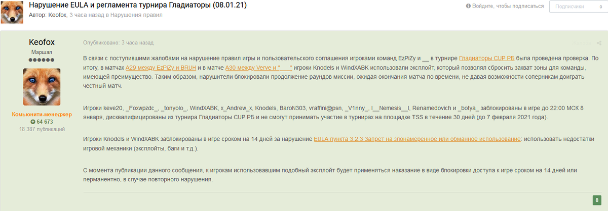 08.01.2021 года Keofox заявил о том, что во время проведения турнира: "игроки Knodels и WindXABK использовали эксплойт, который позволял сбросить захват зоны для команды, имеющей преимущество". И в связи с этим Knodels и WindXABK заблокированы в игре сроком на 14 дней за нарушение EULA пункта 3.2.3 Запрет на злонамеренное или обманное использование: использовать недостатки игровой механики (эксплойты, баги и т.д.).