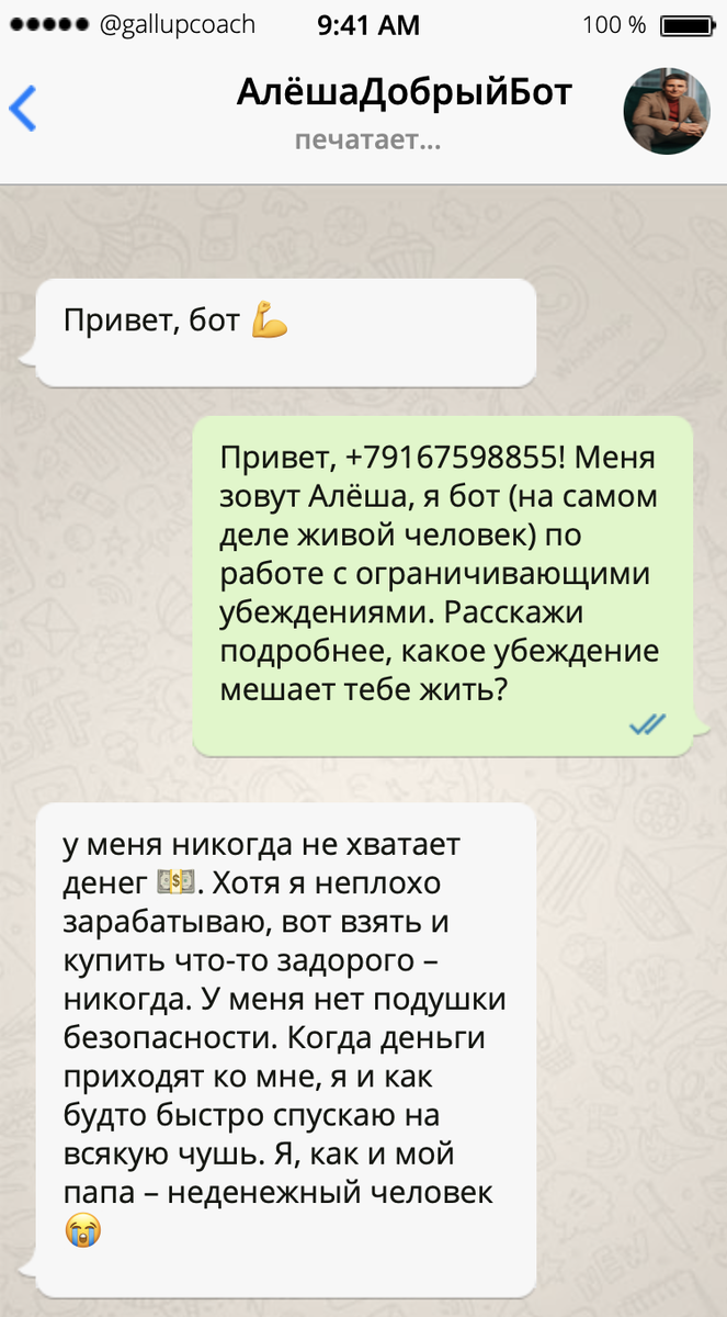 Привет, +79167598855! Меня зовут Алёша, я бот (на самом деле живой человек) по работе с ограничивающими убеждениями. Расскажи подробнее, какое убеждение мешает тебе жить?