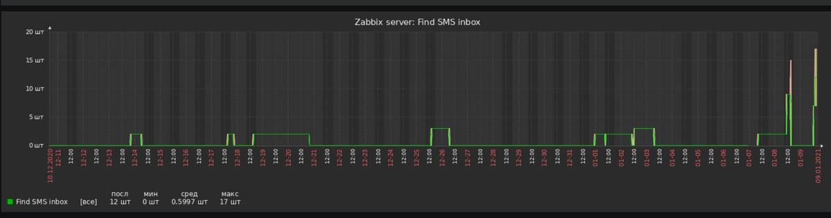 Вчера мне пришло уведомление о наличии входящих сообщений на номере , симка которого установлена в USB-модеме. - использую для умного дома . ниже график мониторинга количества входящих смс.