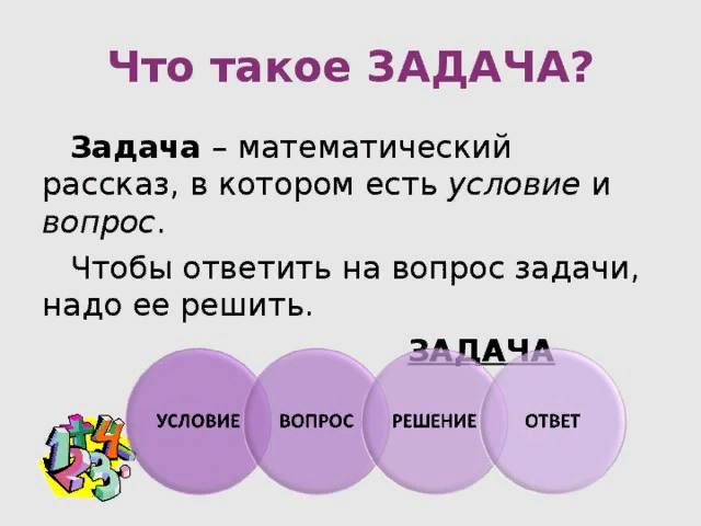 Решение задач - это важнейшее средство формирования математических знаний, умений, навыков учащихся, но в то же время- это одна из основных форм изучения математики, а также средство математического развития ребенка. Учить задачам необходимо ОБЯЗАТЕЛЬНО! Виды задач: Мы разберем сегодня с Вами только несколько видов задач. С задачами в начальной школе ребенок сталкивается уже с первого класса. Но, я считаю, что задачи находятся всегда в нашей жизни. Любой бытовой момент и в голове у нас уже возникают данные, условие и вопрос? "Мама купила сегодня 6 конфет мне и брату. Сказала отдать брату 3 конфетки. Интересно, а сколько останется у меня?" и таких задач в голове возникает бесчисленное множество. Поэтому, мы всегда начинаем с простых задач, они являются составными частями одного из способов введения составных задач в будущем. Решение составной задачи всегда начинается знакомством с условием и вопросом к ней. Далее используются специальные приемы, которые помогают детям вычленить вели