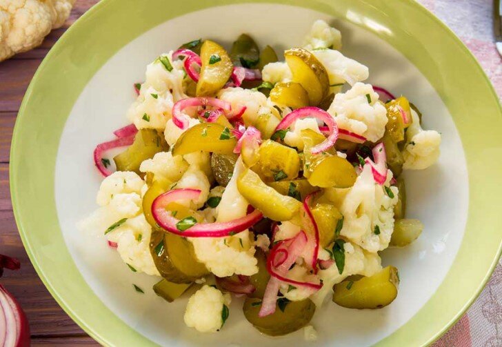 Когда я впервые приготовил салат из цветной капусты с солеными огурцами, я не поверил, что такое просто возможно. При минимуме очень простых ингредиентов получается такой удивительный вкус. Хрустящая, практически сырая цветная капуста, сочные соленые огурцы и острый лук – это идеальное сочетание, которое вы обязательно должны попробовать.