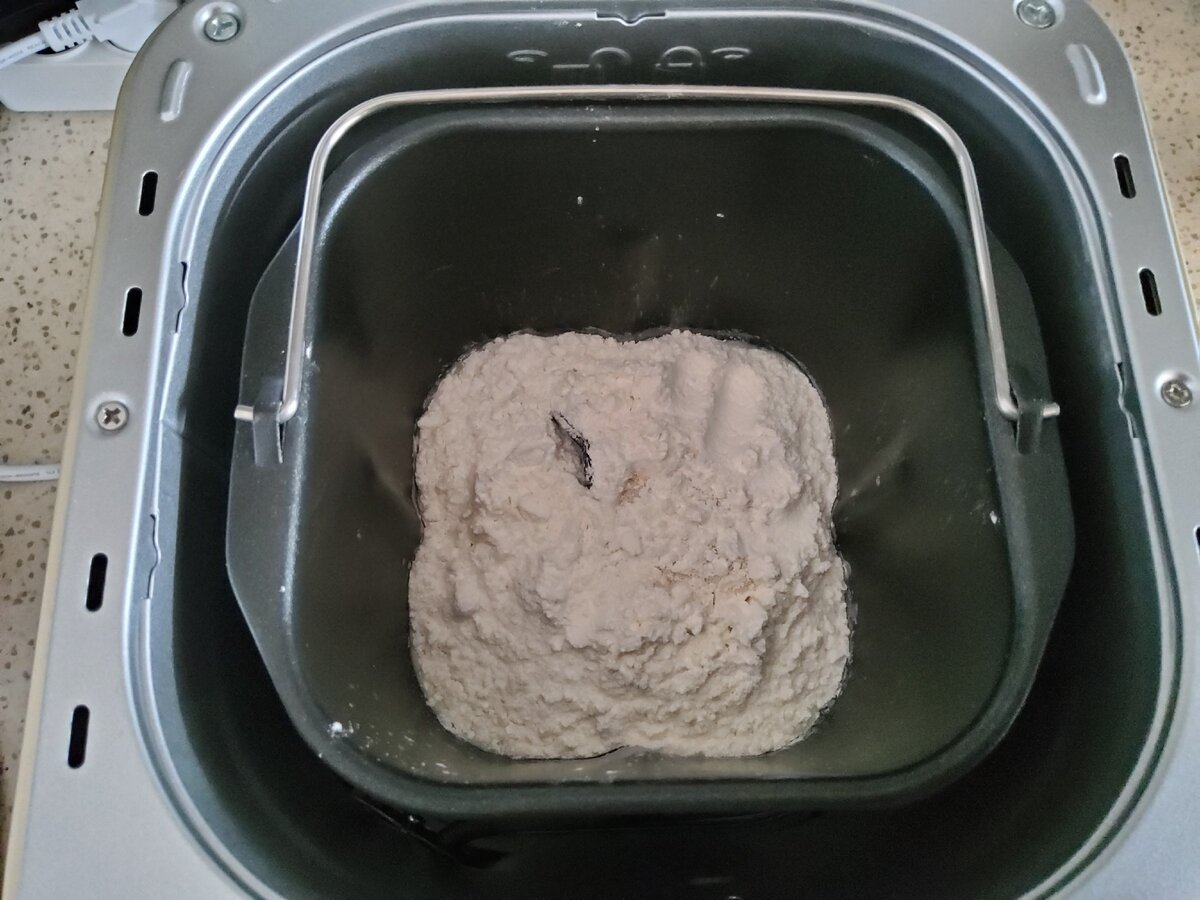 1. Владельцы хлебопечек могут загрузить все ингредиенты (мокко тесто не трогаем) в соответствии с последовательностью, указанной в инструкциях к своим агрегатам, и предоставить замес теста машине. В моем случае последовательность такая: теплое молоко - яйцо - сахар - соль - мука (просеять через сито) - сухие дрожжи. Включаем режим "Тесто" (или аналогичный) и ждем пока машина усердно работает в течение 25-30 минут, после чего останавливаем программу. Нам нужен лишь сам замес, расстойка не нужна. Сливочное масло комнатной температуры добавляем через 5-7 минут после начала программы.