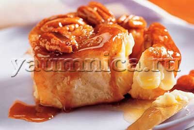6. Нагреваем духовку до 200 градусов. Выкладываем в круглую форму или сковороду и выпекаем 30-35 минут или до золотистого цвета. Ставим жаропрочную тарелку вверх дном на сковороду и переворачиваем тарелку и сковороду. Даем сковороде постоять около 1 минуты, чтобы булочки пропитались карамелью. Булочки с орехами подаем к столу. Приятного аппетита!