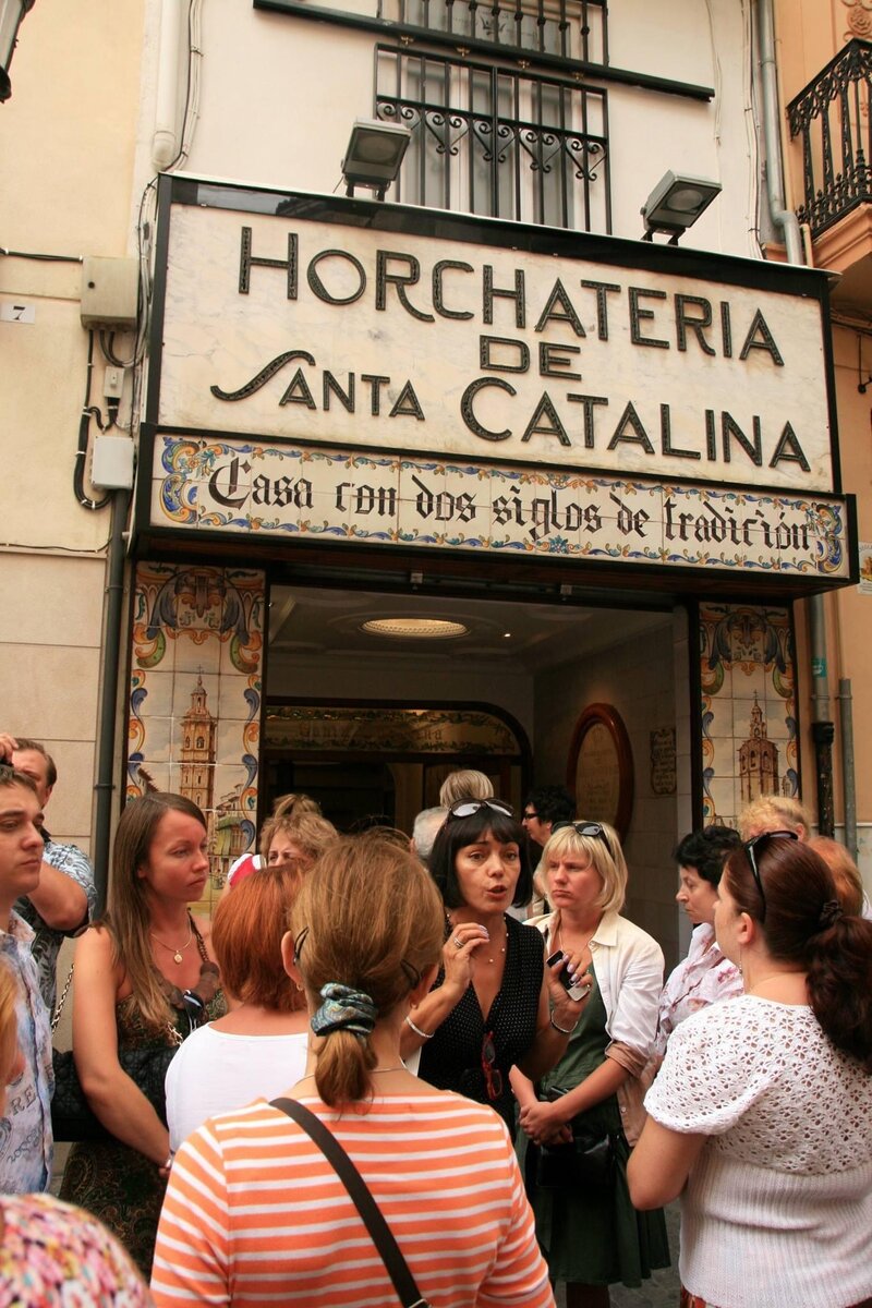 Жил в тринадцатом веке сильный и харизматичный политик - король испанского Арагона Хайме I. Он изгнал мавров из Валенсии и из почти всех других испанских территорий, заключив при этом мир с Гранадским эмиратом. В общем, одна из главных фигур Реконкисты. Как-то жарким днём случилось королю Хайме испить после плотного обеда необыкновенный освежающий напиток. Кувшин поднесла ему красивая девушка. Эмоции переполнили монарха, и он воскликнул: «Açò no és llet, açò és OR, XATA!» («Это не молоко, это золото, солнышко», - примерный перевод. Знатоков испанского, его древних вариантов и диалектов приглашаю прокомментировать). Так или иначе, слова правителя вошли в легенду, которая стала красивой рекламой напитка под названием «орчата». Готовят орчату из земляного миндаля (чуфы). Могу заверить: действительно очень достойный напиток с особым вкусом, напоминает холодное молоко. В жару, конечно, каждый первый вспомнит ощущения короля. Грамотный вековой пиар работает. На снимке - вход в орчатерию, ч