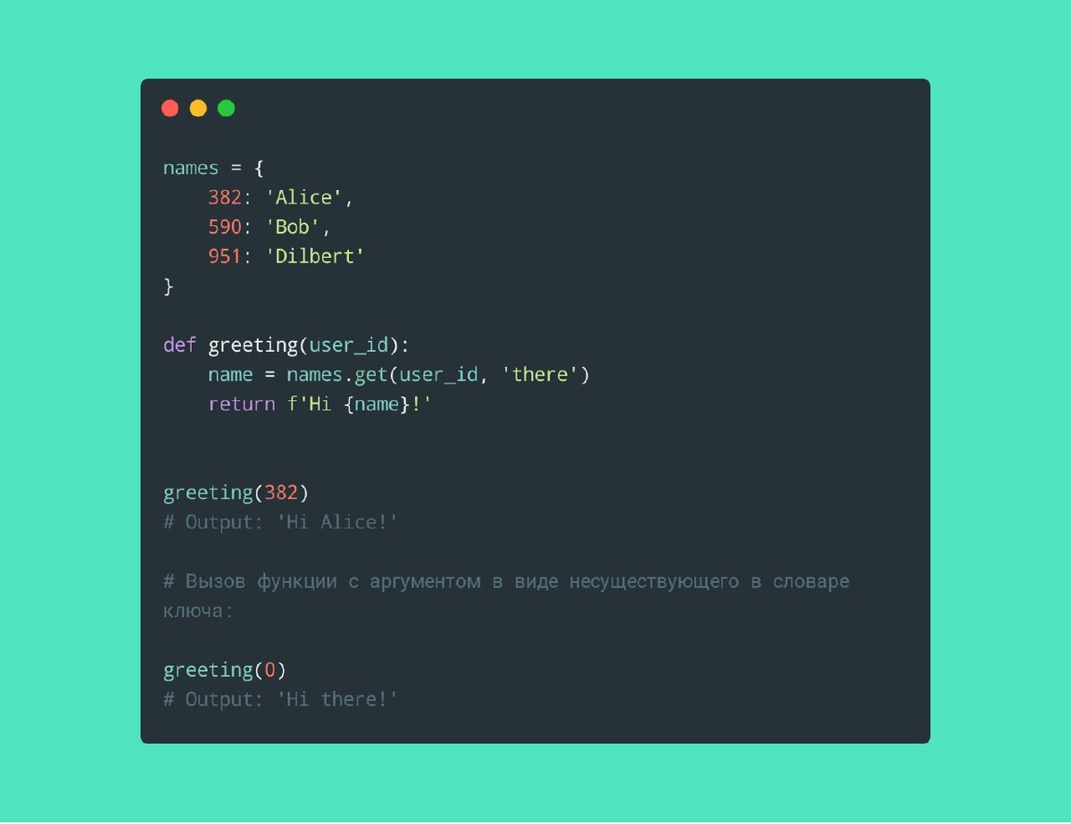Однако если такого ключа в словаре нет, то исключение не выбрасывается, а возвращается значение по умолчанию, которое передаётся вторым аргументом, или же None, если второй аргумент не передан.