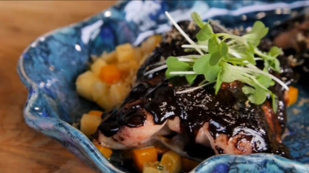 Рыбу намазываем шоколадной глазурью. Выкладываем соте из овощей в тарелку. На соте красиво размещаем рыбу. Украшаем рыбу любой свежей зеленью.