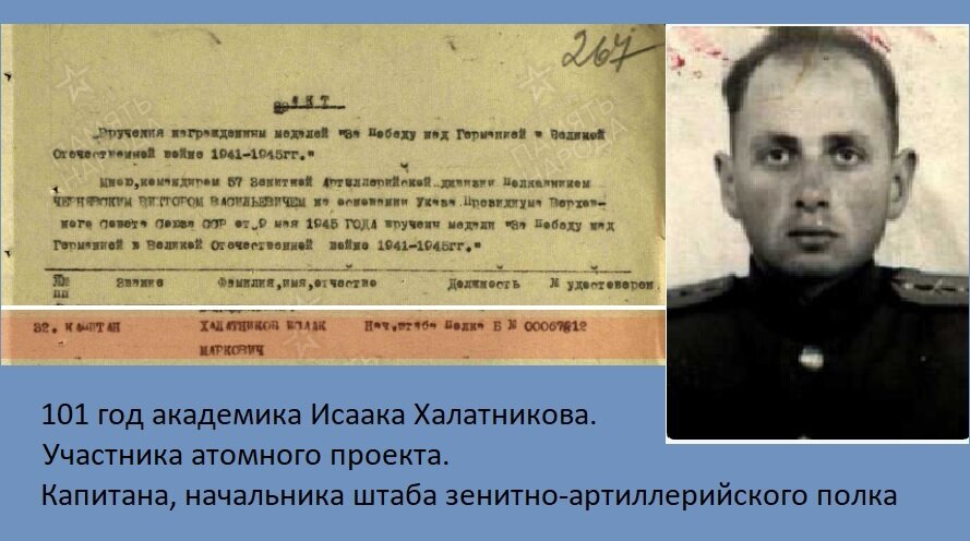Но только сейчас, обратившись к базе документов периода войны, я узнал, что до перевода в Институт физических проблем Исаак Маркович с 1943 по 1945 год в звании капитана служил под Москвой в должности начальника штаба зенитно-артиллерийского полка в 57-й зенитно-артиллерийской дивизии. В этом качестве никогда ранее не представлял академика.