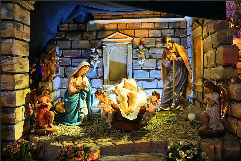 - Рождество Христово — один из самых главных праздников в христианском мире. И, конечно, один из самых любимых. Уже с ноября во многих странах разворачиваются рождественские базары, украшаются дома и улицы, воздух наполняется запахом пряностей. Смысловым ядром события и композиционным центром праздничного оформления является вертеп. Буквально «вертеп» означает пещеру и символизирует вынужденное жилье Святого Семейства. В библейской истории говорится, что по указу императора Иудеи Ирода, для облегчения ведения переписи каждый житель империи должен был явиться «в свой город». Иосиф и Мария направились в Вифлеем, где из-за отсутствия места в гостинице вынуждены были переночевать в пещере, которая использовалась в качестве хлева для укрытия скота от непогоды. В евангельском рассказе Богородица, как в колыбель, положила новорожденного младенца Иисуса в ясли — кормушку для домашних животных. Поэтому рядом с яслями изображают осла и телёнка (или вола). Такова центральная сцена традиционной рождественской скульптурной композиции — младенец в яслях, коленопреклоненная Мария, Иосиф, фигура ангела и ослик и теленок, согревающие дыханием ребенка.
