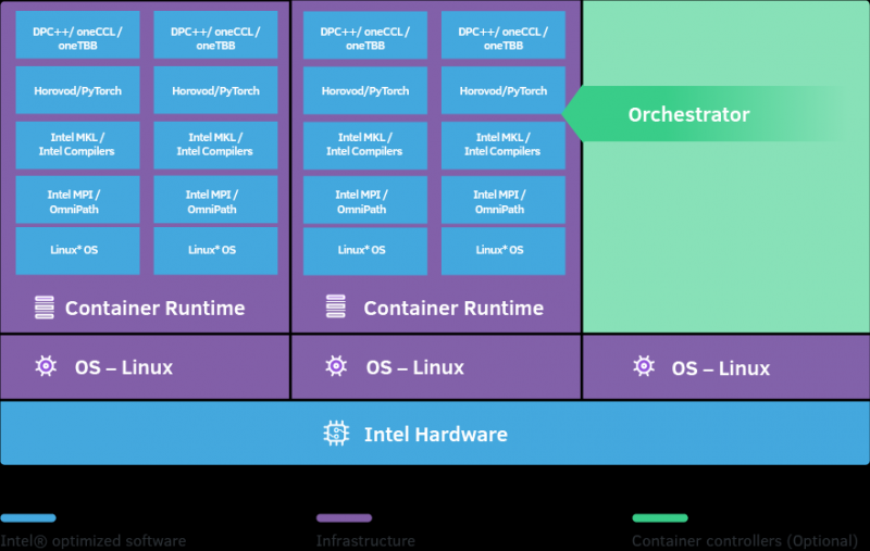 Компания Intel выпустила набор ПО High Performance Computing Reference Stack (HPCRS) версии 2.0, который оптимизирован для рабочих нагрузок HPC/AI. Его архитектура представлена ниже.