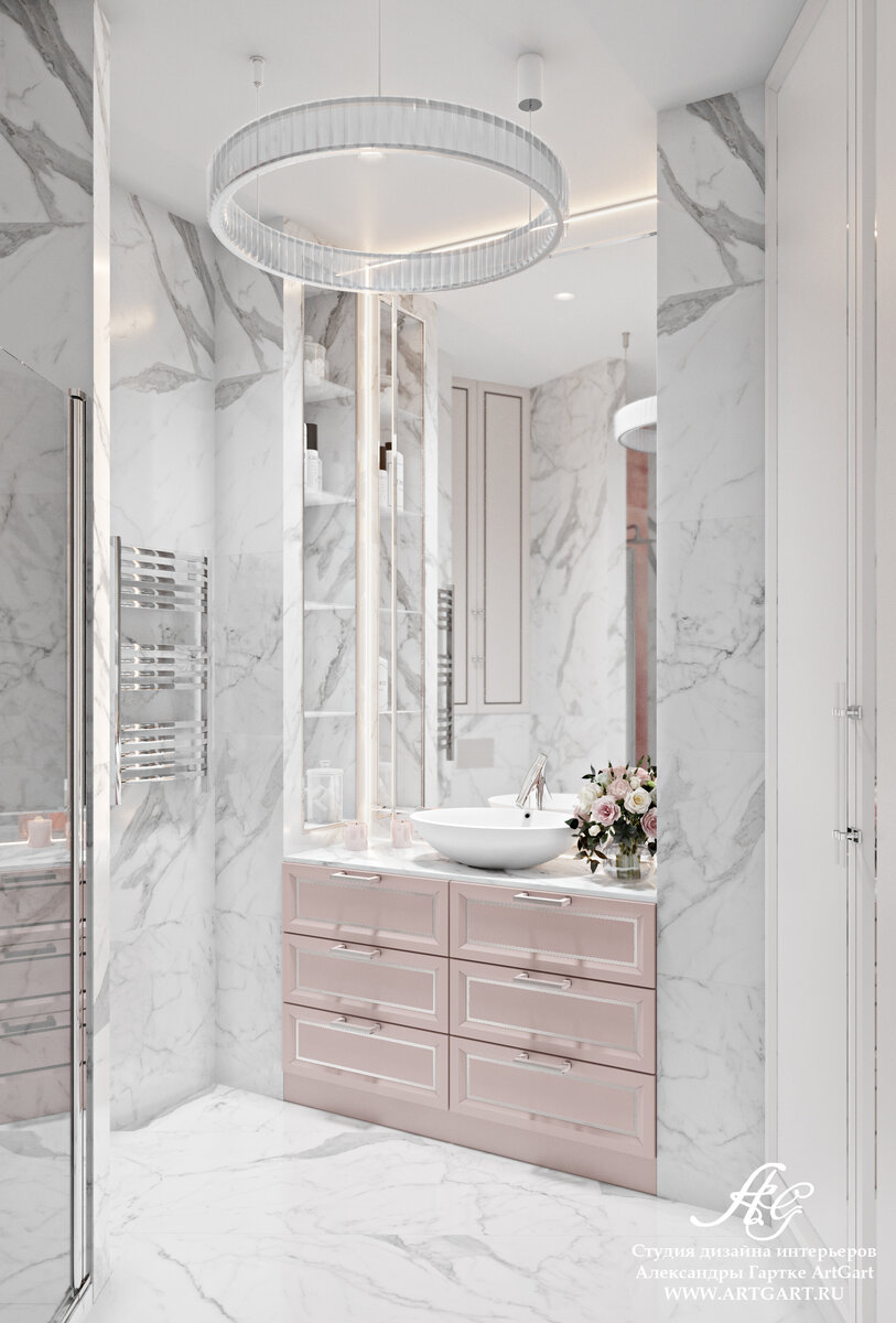 Ванная в квартире для молодой девушки #невский_72м В ванной на стене та же плитка, которую мы используем на полу во всей квартире. Розовый🌸 мы использовали локально: на тумбочке и в декоре на стене за душем. В одном из проектов мы уже использовали прием с нишами и подсветкой зеркала. Заказчице очень понравилось, поэтому мы его повторили и здесь. Обычно мы делаем подвесные тумбы, но так как заказчица проводит много времени в ванной, тумбу мы сделали в пол, чтобы хватило места для хранения обширной коллекции косметики и средств по уходу. В большом встроенном шкафу скрыта стиральная и сушильная машина. Небольшой шкафчик есть над инсталляцией. Душ встроенный, у нас получилась красивая ниша, чтобы стен было три, а стеклянная перегородка одна. Так душ выглядит наиболее правильно👌 Редко мы делаем в ванных люстры, но тут нам повезло, ведь заказчица их очень любит. А мы их любим за то, что люстры моментально превращают ванную из подсобного помещения в полноценную комнату! Не заб