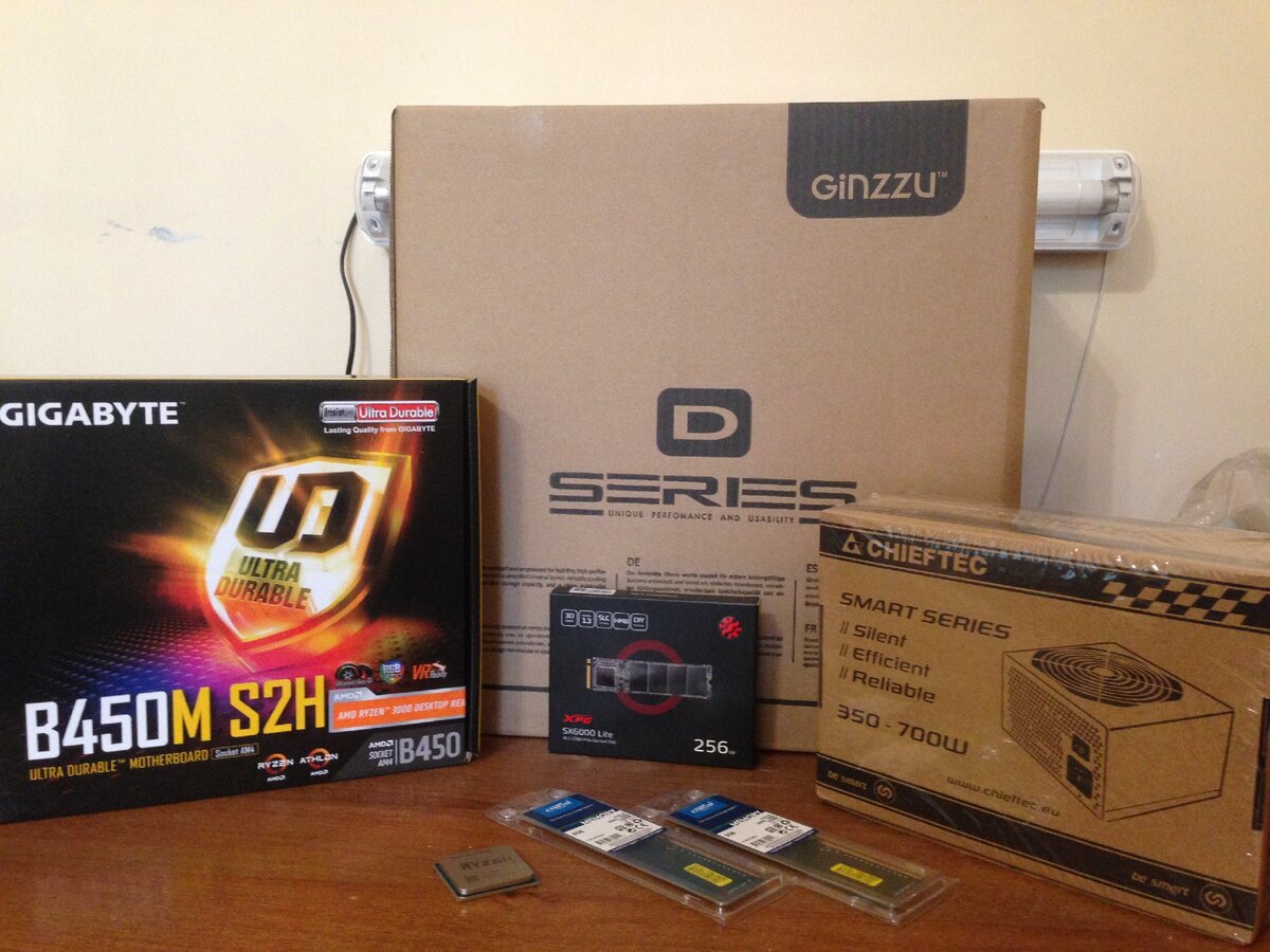 Материнская плата Gigabyte B450M-S2H. Здесь есть все что необходимо: разъём М2, 2 слота под оперативную память,8 пин питание процессора, массивный радиатор на цепи питания и т.д.