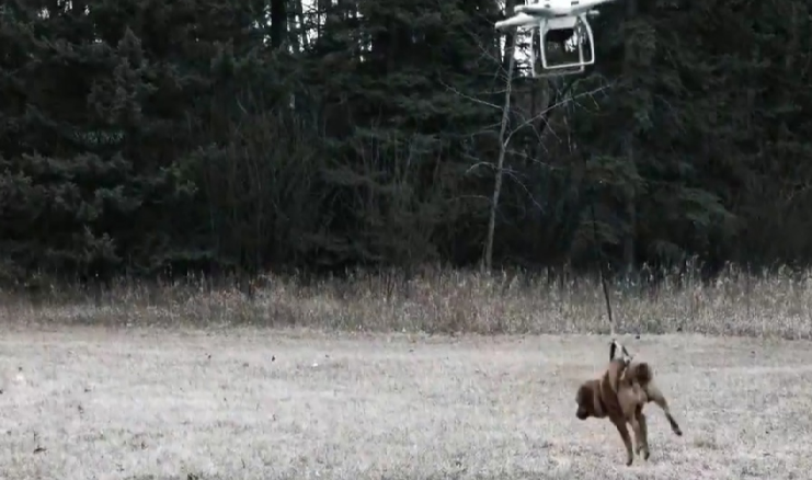 Сперва мы решили выгуливать собаку с помощью дрона. Собака сперва не понимала, как это происходит и кто ведет её за поводок. А потом мы решили её немного