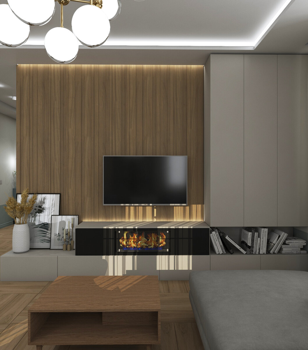 Это проект достаточно большой кухни-гостиной для семьи в частном доме, площадь помещения 45,15 м2