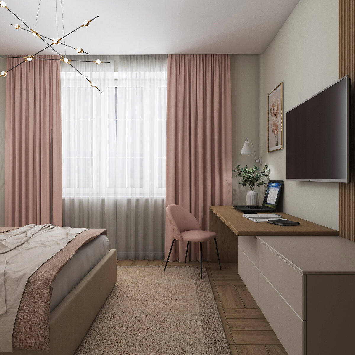 В спальне мы расположили двухспальную кровать большого размера 1800*2000 мм, встроенный шкаф для хранения одежды и рабочий стол, который переходит в комод.